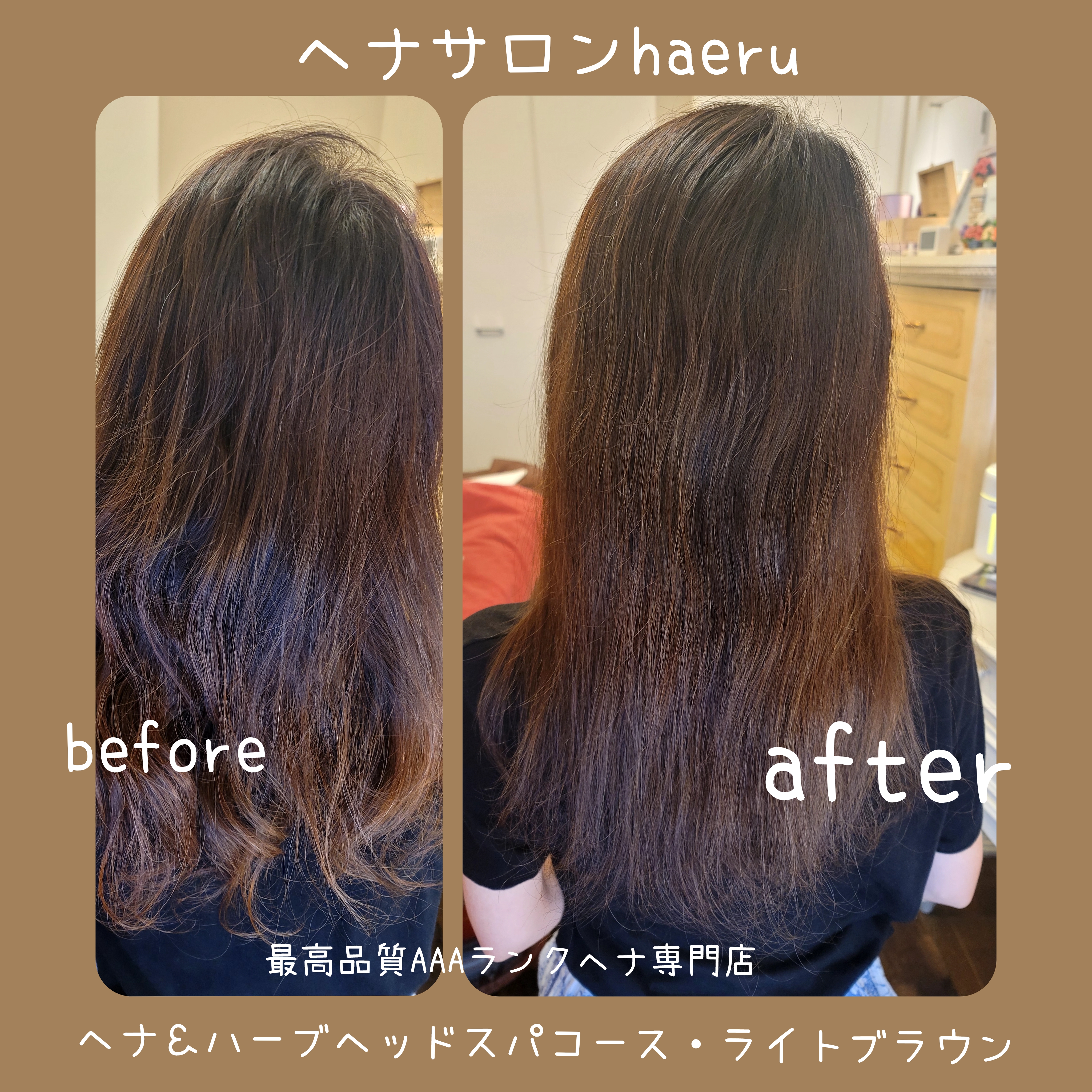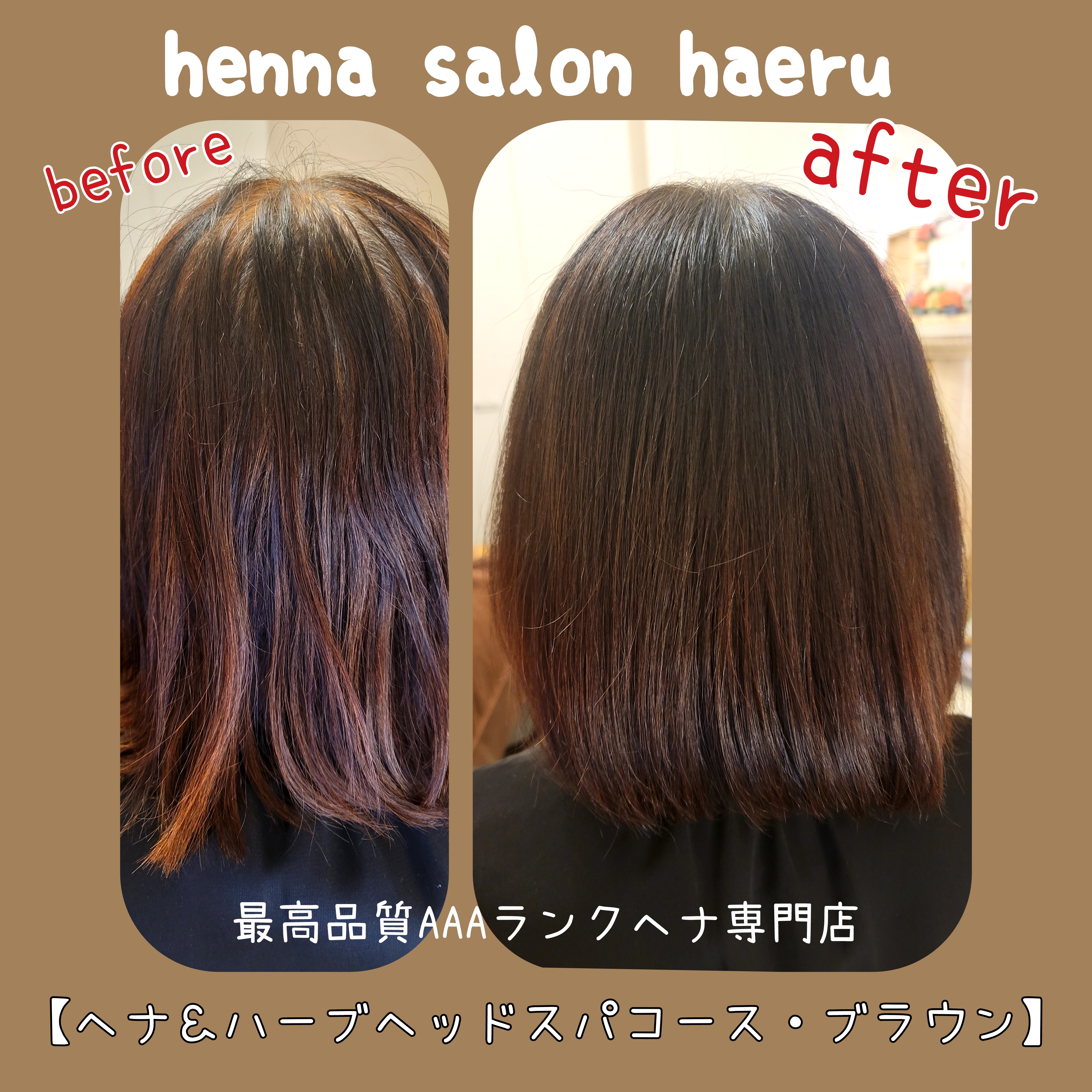 最近髪のくせが強くなり、白髪が増え鏡を見るたび落ち込んでいました。今日、ヘナをして頂いて、白髪もしっかり染まり、色もよく、数ヶ月ぶりに髪の毛がまとまりました。