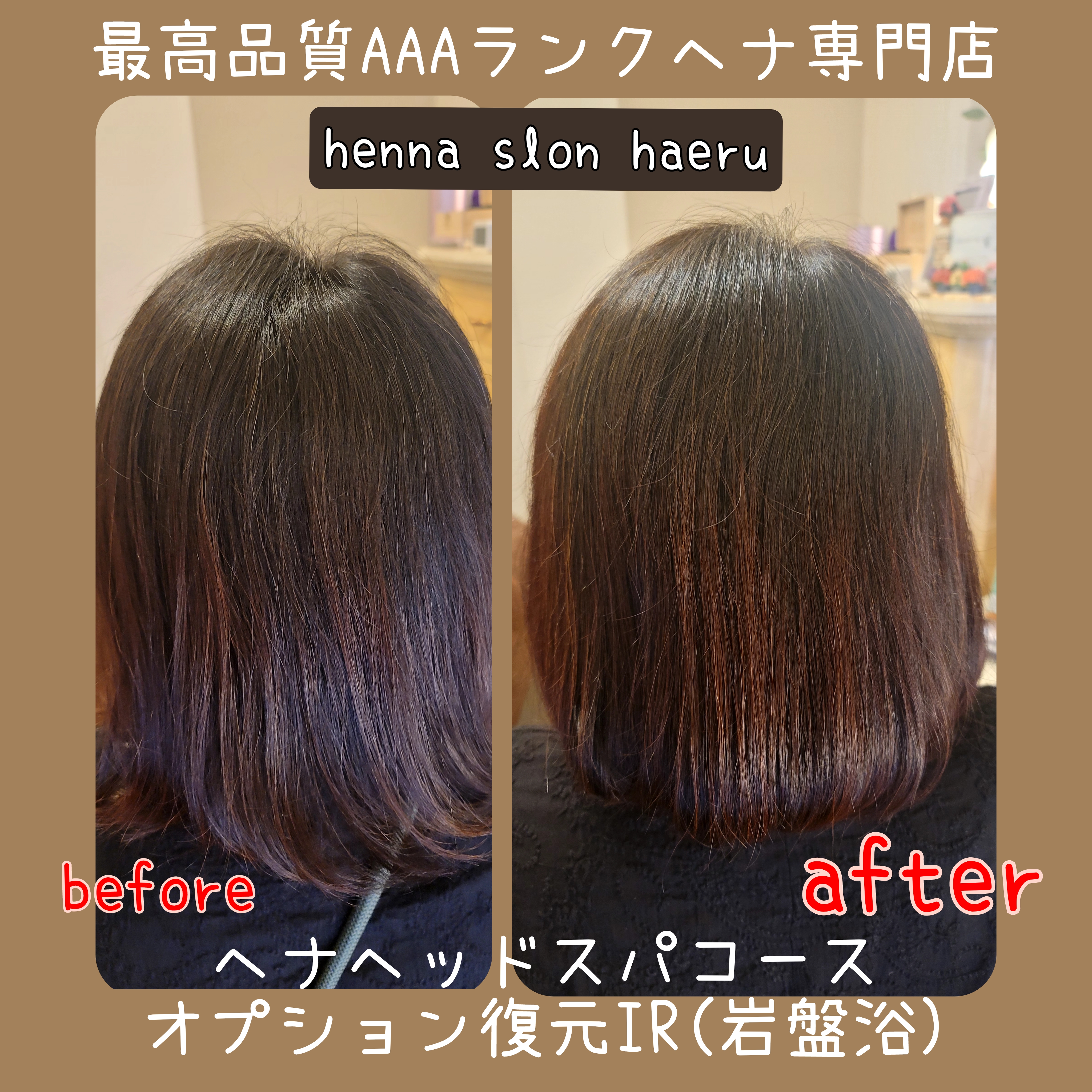 今日は、ありがとうございました。予約の時は、少し高いなと思ったのですが、髪の事も色々聞きながら、気持ちの良い復元敷パッドとベッドで最高品質のAAAランクヘナをして貰い、うっとりの3時間でした♪(*^^*)