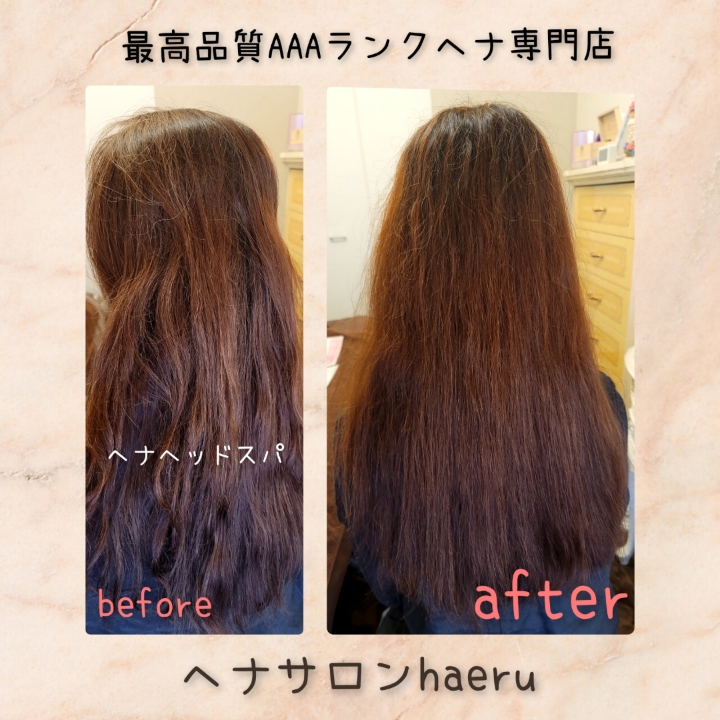 今日は、ありがとうございました。予約の時は、少し高いなと思ったのですが、髪の事も色々聞きながら、気持ちの良い復元敷パッドとベッドで最高品質のAAAランクヘナをして貰い、うっとりの3時間でした♪(*^^*)
