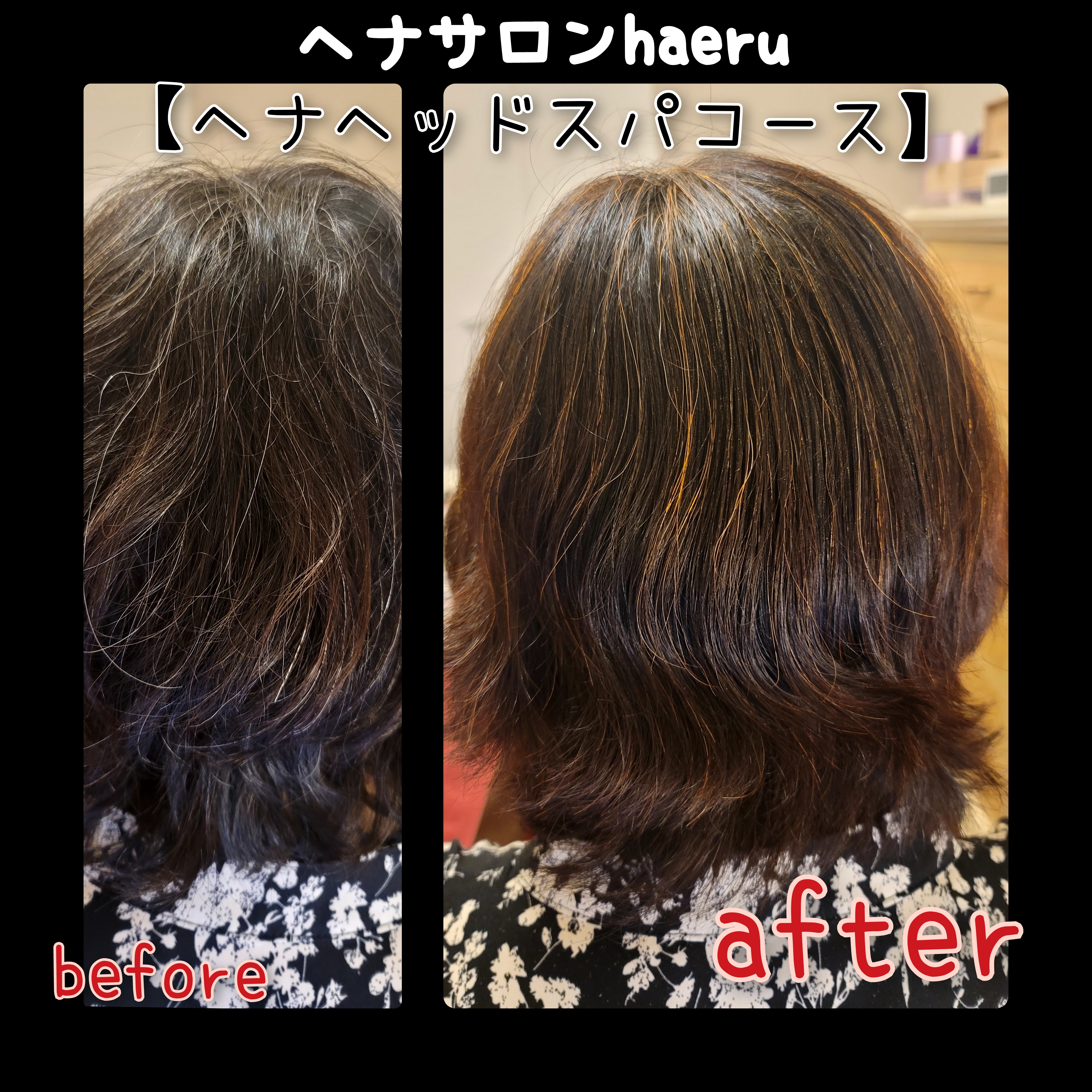 最近髪のくせが強くなり、白髪が増え鏡を見るたび落ち込んでいました。今日、ヘナをして頂いて、白髪もしっかり染まり、色もよく、数ヶ月ぶりに髪の毛がまとまりました。